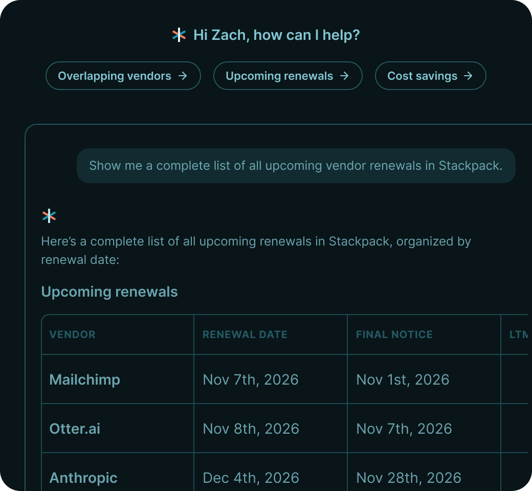 “Stackpack has been essential in helping us stay ahead of vendor renewals. Its centralized platform has streamlined our processes and improved transparency.”